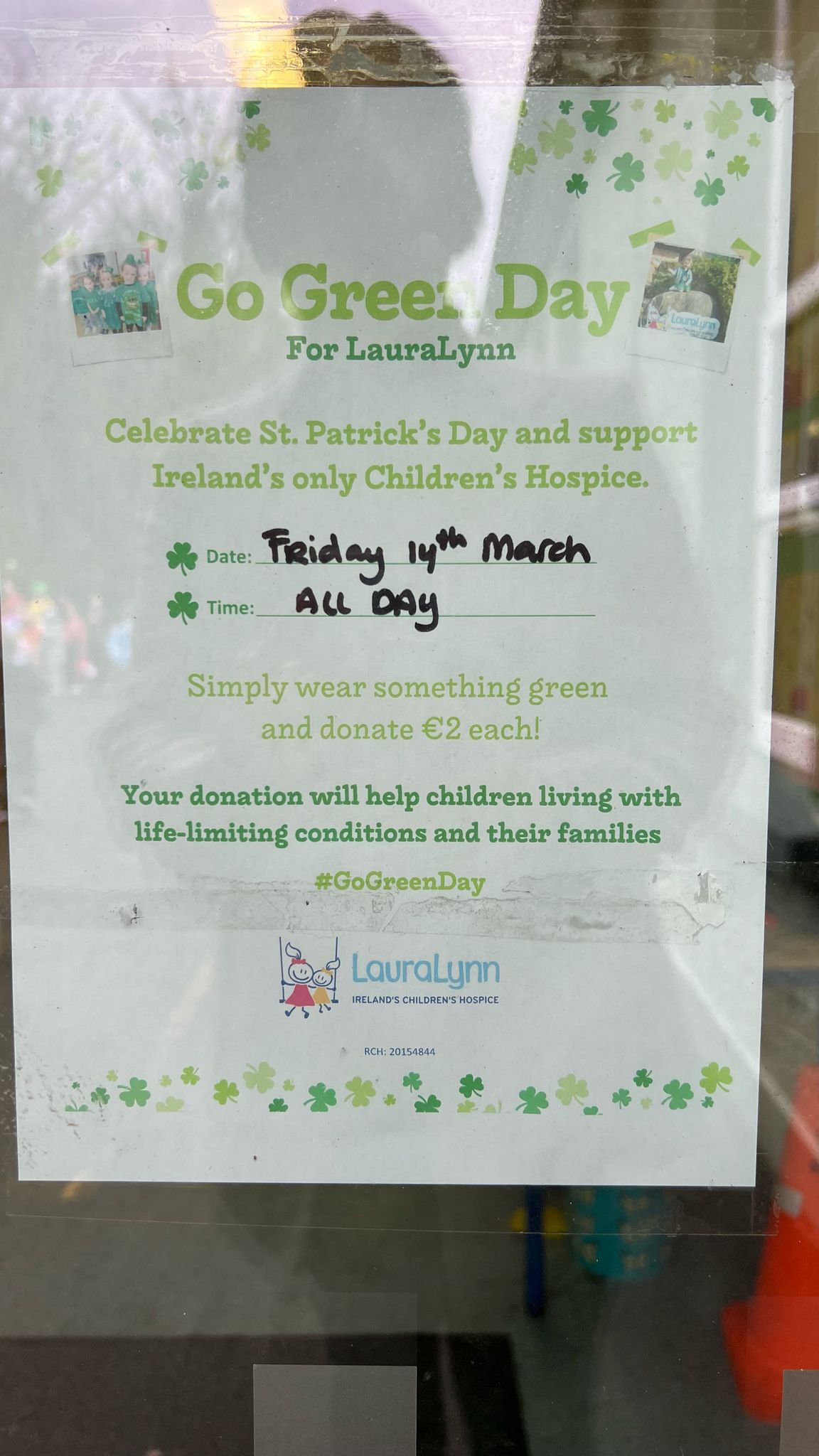 Go Green Day for LauraLynnĀ Fundraiser on Friday 14th March. By wearing green we celebrateĀ LĆ” Glas andĀ we support the children and families in their careĀ with a voluntary donation of ā¬2 or more each.