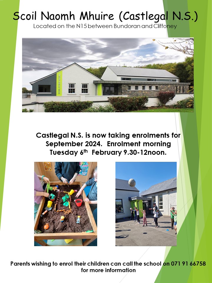 Enrolment morning is on Tuesday 6th February 9.30-12 noon. Castlegal N.S. is now taking enrolments for September 2024. Parents wishing to enrol their children can call the school on 071 91 66758 for more information. Enrolment forms can be picked up at our school.