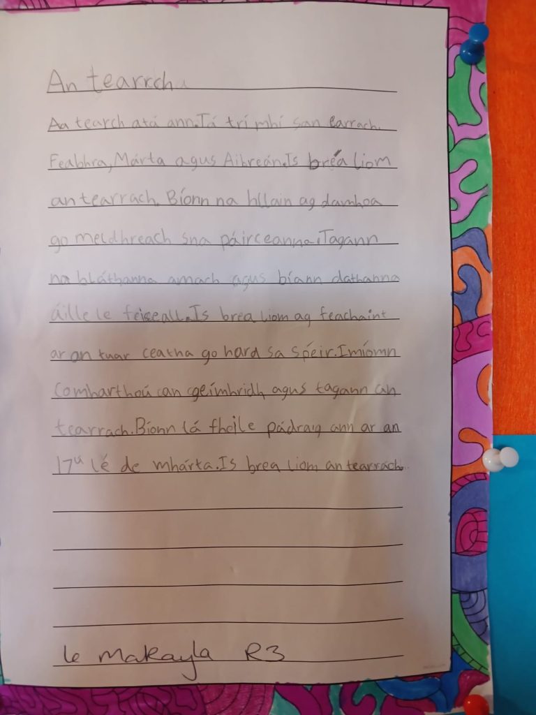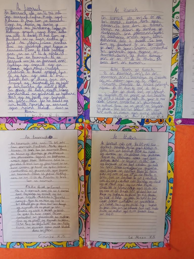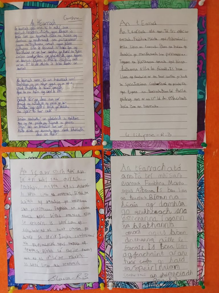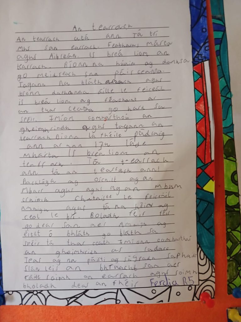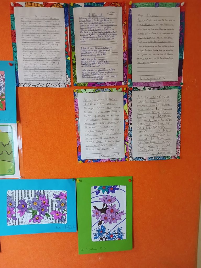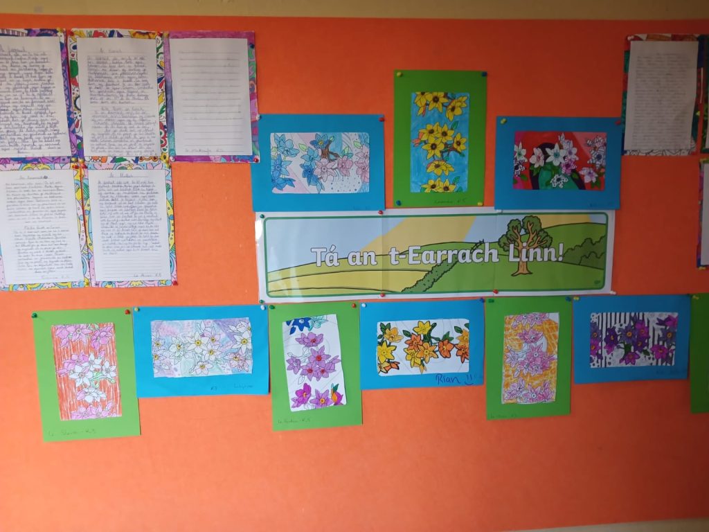 Students welcomed spring by writing in Irish, reinforcing their Irish language skills when teacher dictated An t-Earrach. They illustrated their writing with vibrant drawings of blooming flowers.